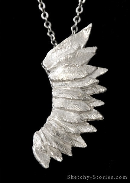 This sterling silver pendant is in the shape of a wing detailed with numerous high polished feathers. It measures 3.6 x 1.5 mm and is completely solid weighing 5.2 grams. Chain not included.