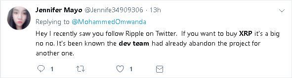 “Thanks for the info, didn’t know the dev team had abandoned the project! I’m going to sell all my XRP right now!!! #satire”.