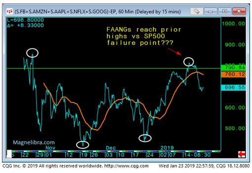 Our favorite chart the FAANGs vs the SP500 did turn down from the levels we highlighted last week as depicted here which seems to be holding the old prior highs. A trade back under those highs should see some follow through: