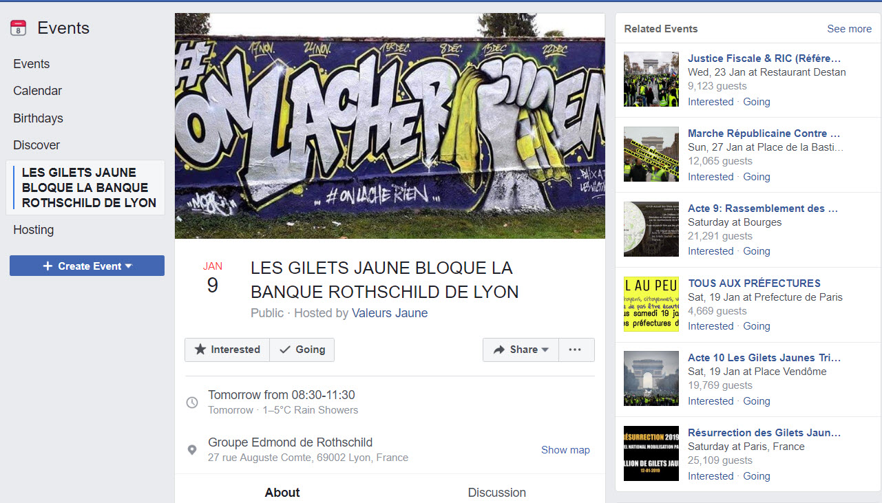 The yellow vests have so far organized their protests largely on social media. According to the Facebook event mentioned above, some 300 have confirmed and more than 3,000 are interested in attending the protest at the Rothschild Bank of Lyon tomorrow.